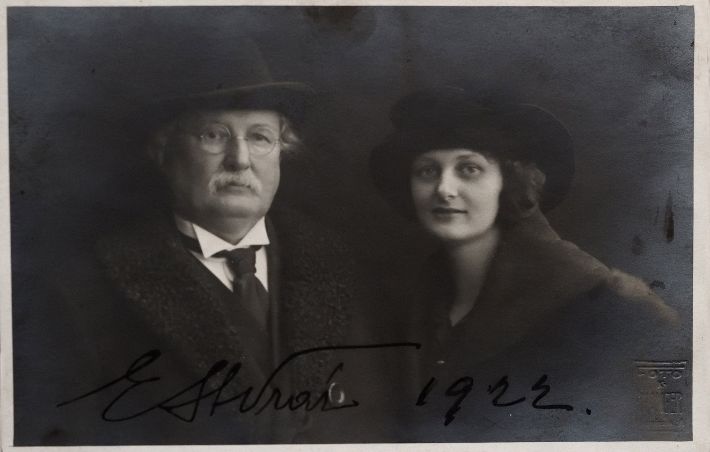 Na snímku je unikátní fotopohlednice známého cestovatele E. S. Vráze s chotí. Raritu pohlednice ještě více podtrhuje ještě podpis cestovatele s letopočtem.